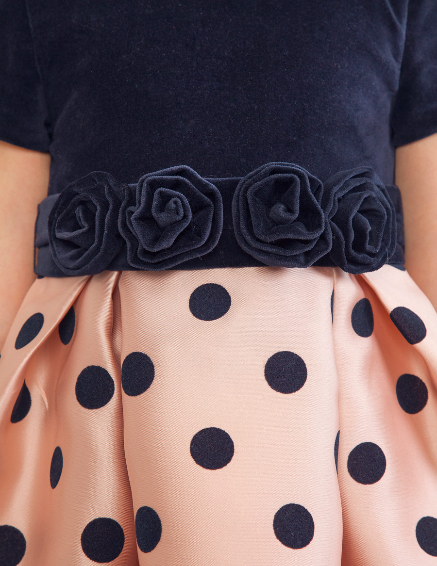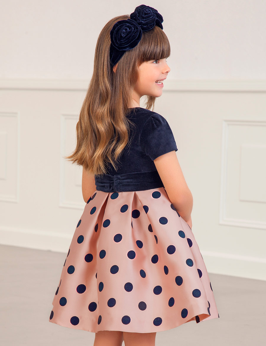 Delicado y exquisito vestido confeccionado en mikado con forro y tul cancán para dar más cuerpo a la falda. Falda con pliegues y delicado estampado. Corte a la cintura con fajín a tono con la parte de arriba de terciopelo. Cierre con cremallera invisible en la espalda. Ideal para llevar en ocasiones especiales.