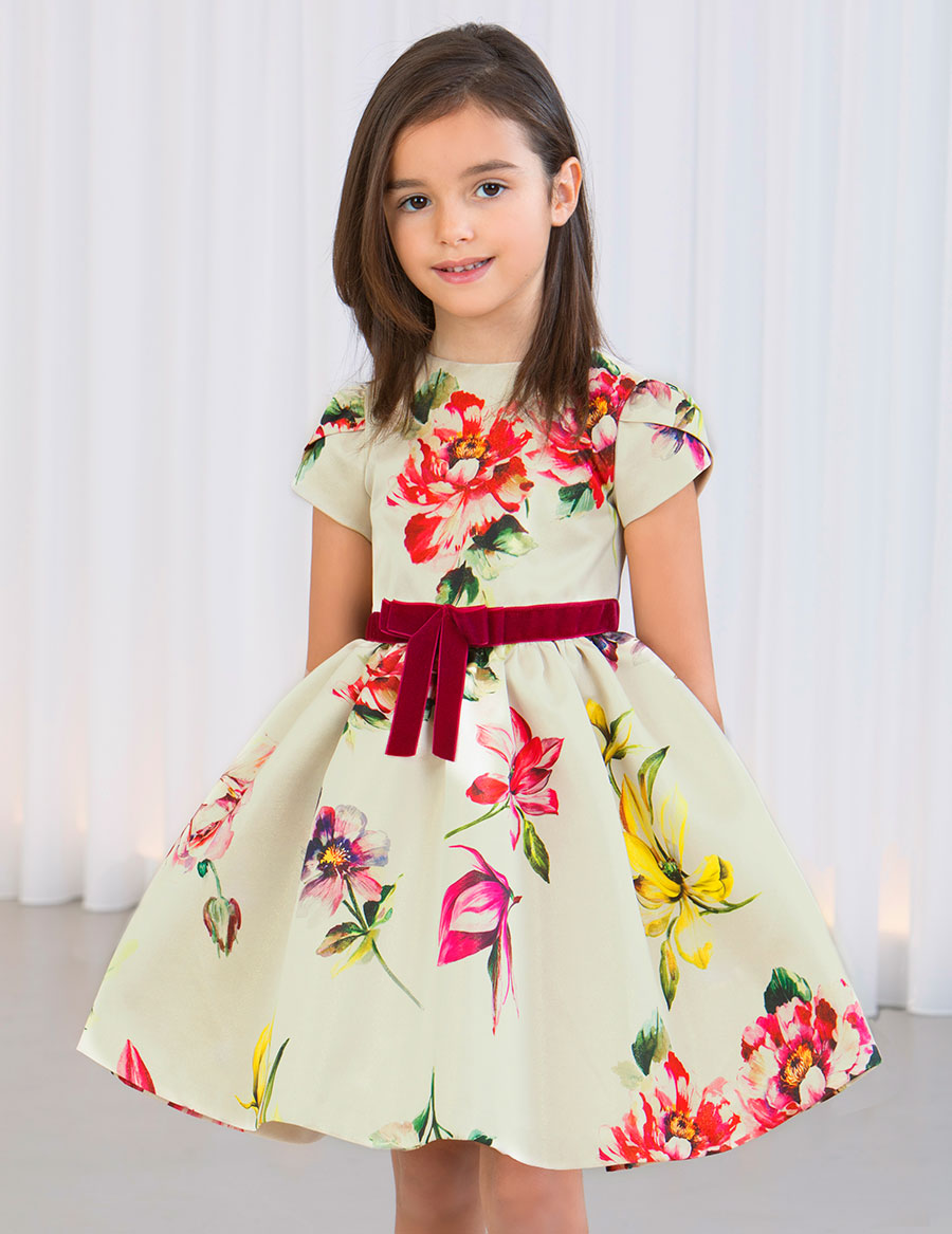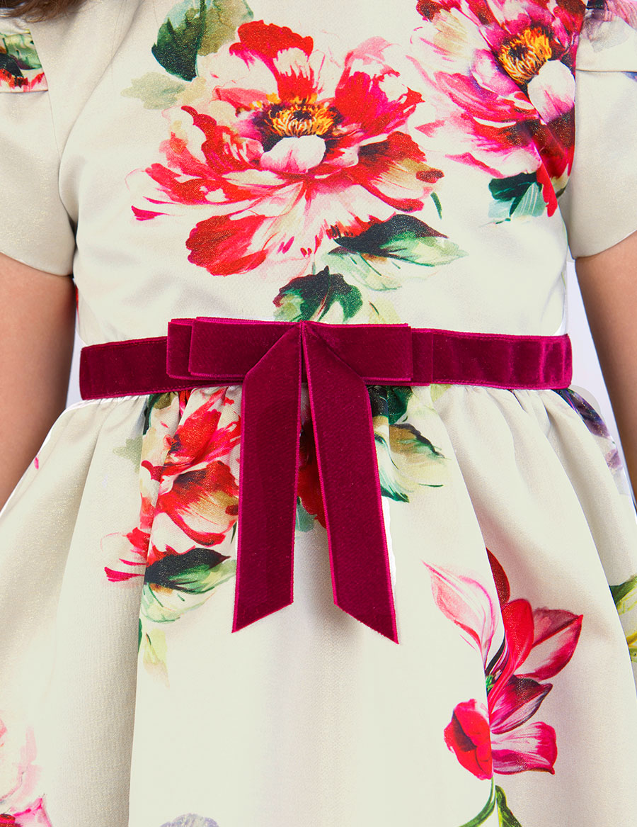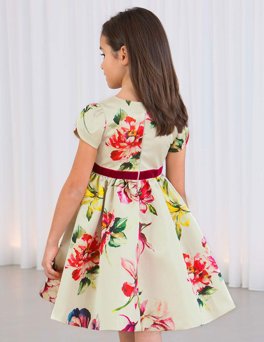 Elegante vestido confeccionado en tafetán con estampado de flores. Mangas cortas con pliegues. Corte en la cintura con cinta de terciopelo y lazada. Pliegues en la falda para darle mayor vuelo. Cremallera invisible en la espalda para el cierre. Un diseño bonito, ideal para las grandes ocasiones.