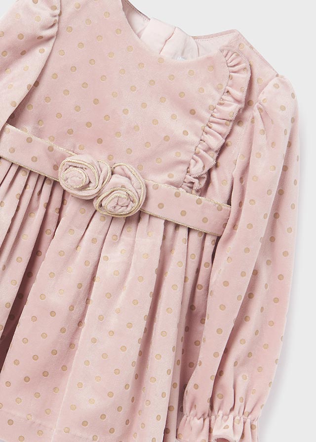 Precioso vestido de terciopelo y manga larga con topos dorados. Cierre con cremallera invisible en la espalda. Forro interior.