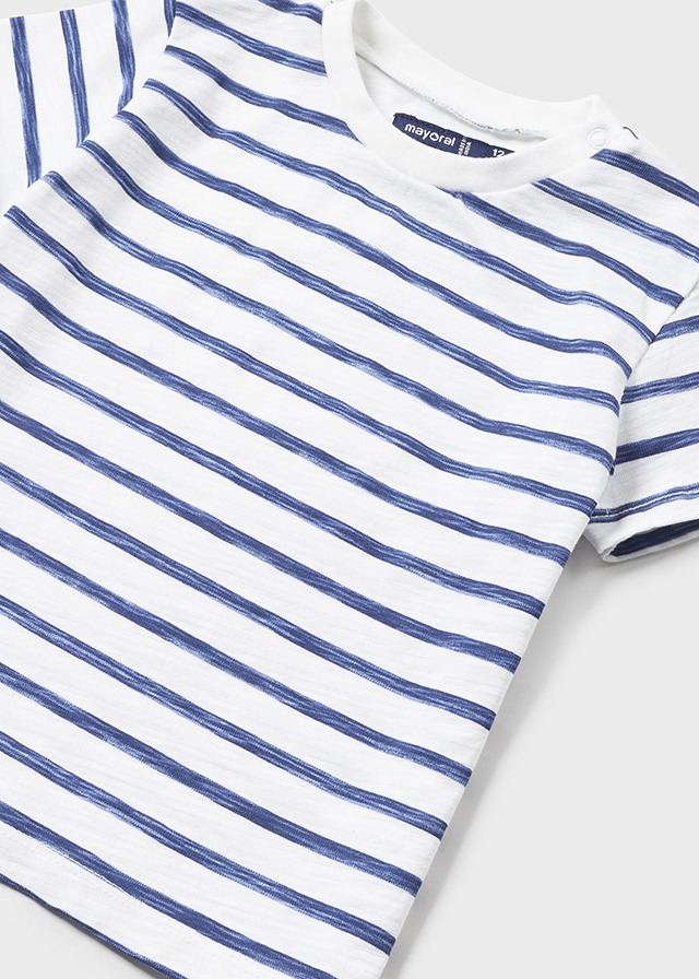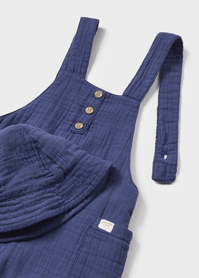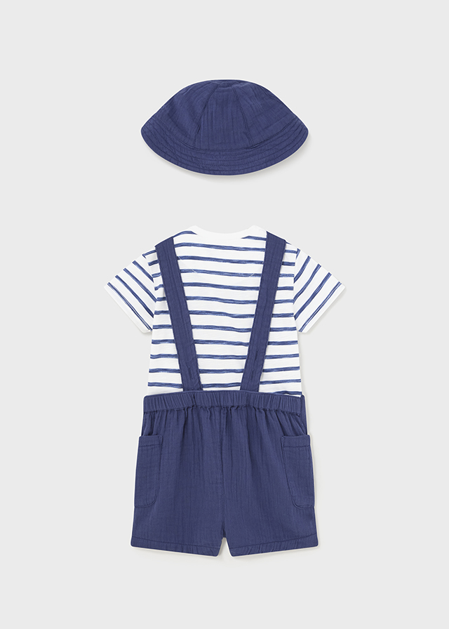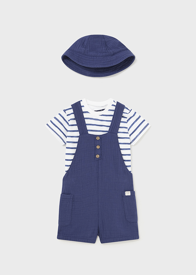 Conjunto de 3 piezas para niño. Compuesto por peto corto de bambula, camiseta y gorro.