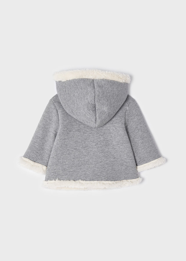 Chaquetón con capucha, forro polar de borrego y cierre delantero mediante botones.