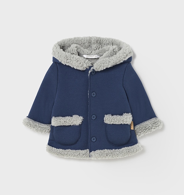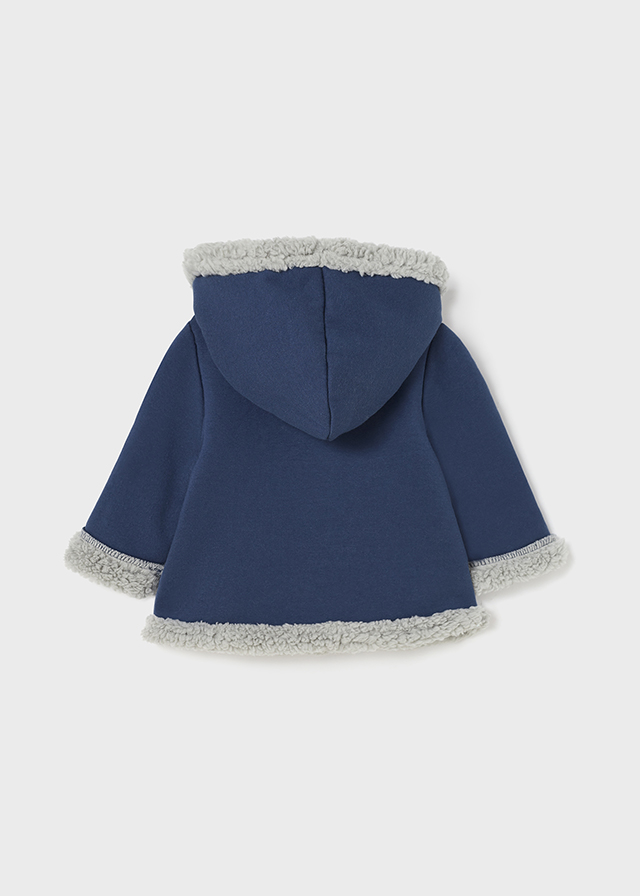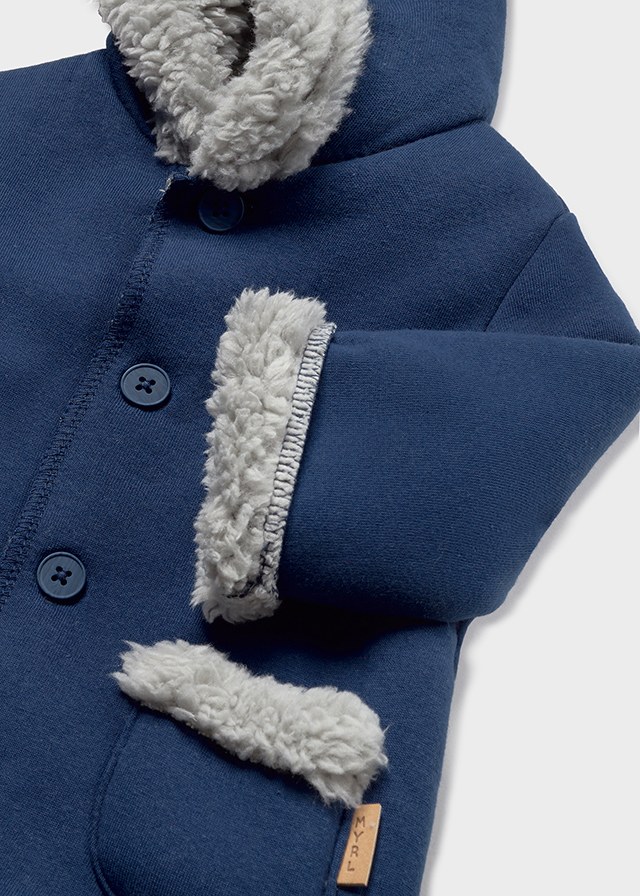 Chaquetón con capucha, forro polar de borrego y cierre delantero mediante botones.