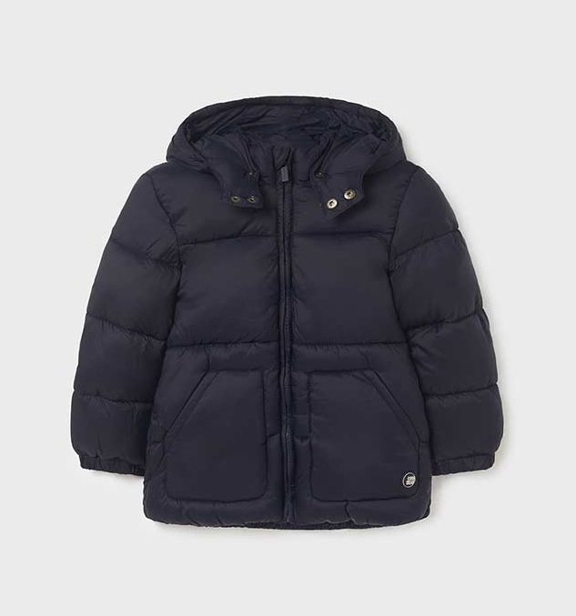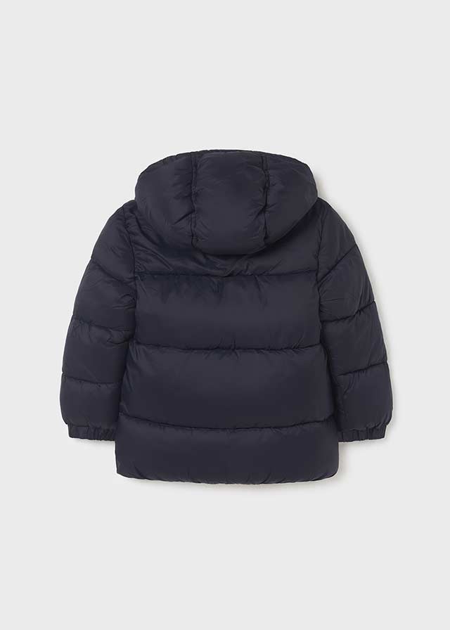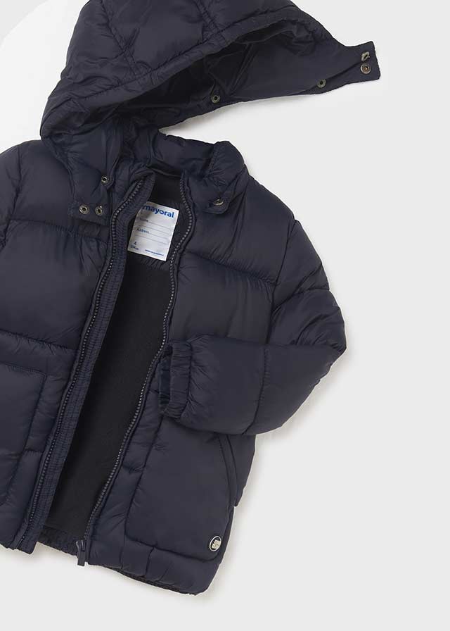 Chaquetón para niño. Cierre mediante cremallera invisible y capucha desmontable.