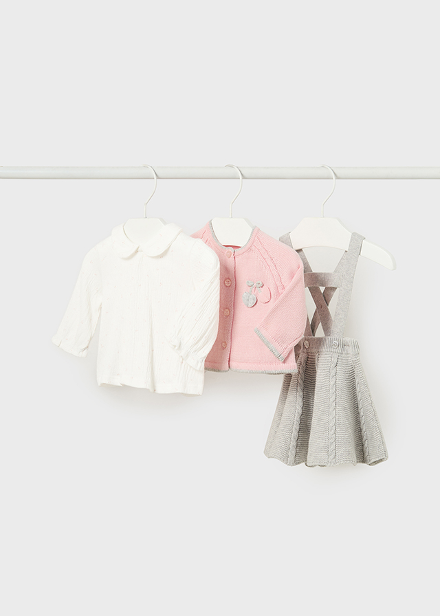 Conjunto de 3 piezas para niña, compuesto por rebeca, blusa y falda con tirantes.