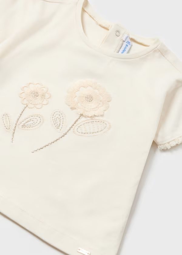 Camiseta de manga larga para niña. Cuello redondo y cierre trasero mediante botones a presión.