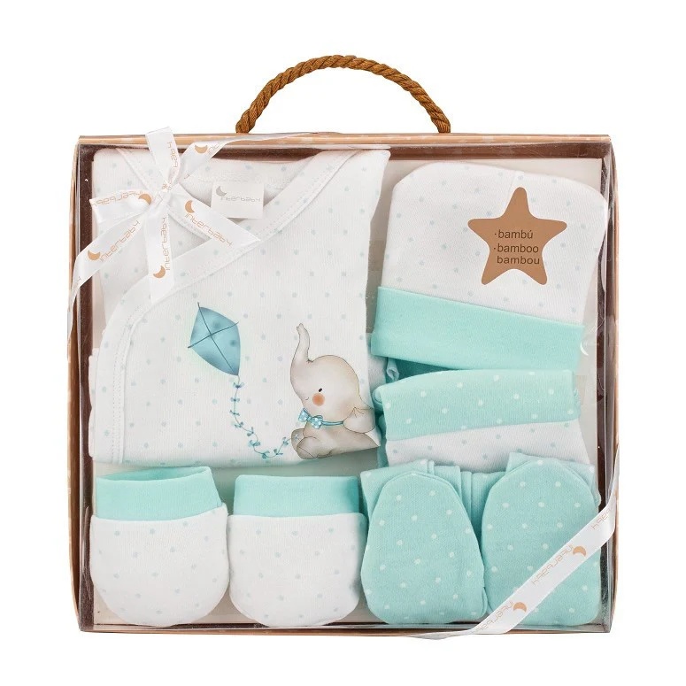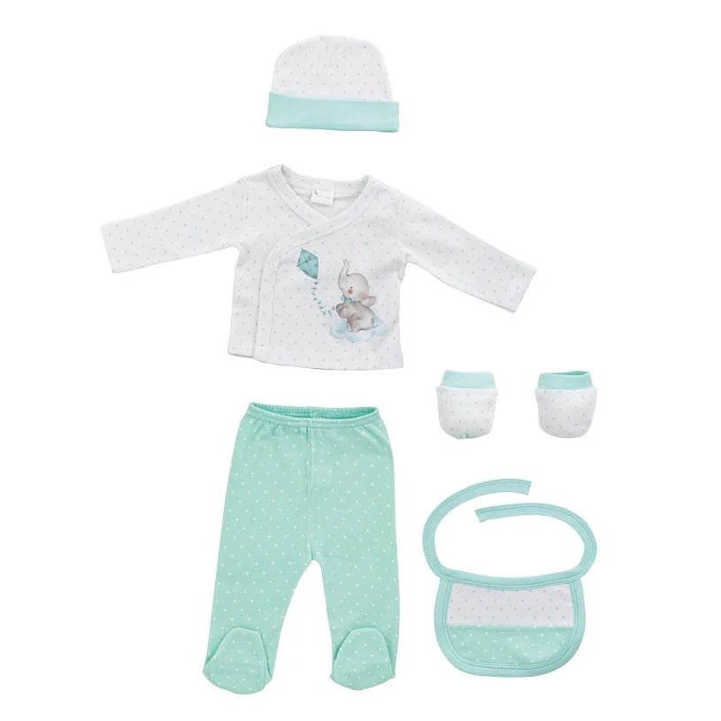 Juego de 5 Piezas para bebé, compuesto por camiseta manga larga, polaina, gorrito, manoplas y babero.